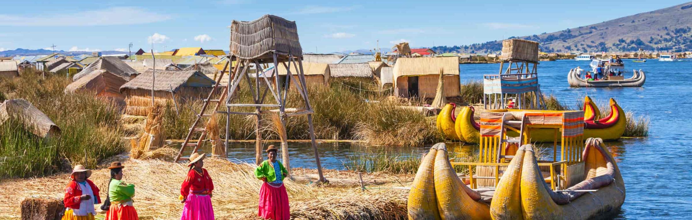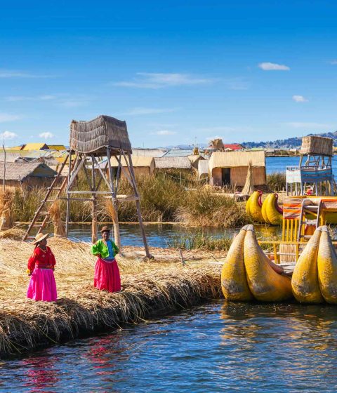 We Pick you up from your hotel at (06:45am Regular Boat) or (7:15am Fast Boat) and then we go to the port, once we board the boat we will have an incredible experience as we will be sailing on the highest navigable lake in the world, that has an average altitude of 3812 m.a.s.l. from our boat we can appreciate the beauty of the Lake and its amazing landscape surrounded by hills and mountains typical of the Altiplano in the central Andes. Uros The floating islands are located in the bay of Puno 12 km away from the port, we sail between 25 and 30 minutes, when we arrive to Uros island we will get a nice experience learning about the lifestyle and traditions that are still preserved in this place, So we have to take a journey to the past to understand the reality that still remains alive, millenary activities, fundamental for the survival of the local population, dedicating themselves to fishing and hunting birds depending completely on the Totora (Aquatic Plant of the Lake) Plant with which they build their islands, houses, rafts and also serves as food and fuel. On the island live very friendly people descendants of the Uros who were one of the oldest ethnic groups that inhabited the highlands, they will be very glad to show us how they have built their islands made with large blocks of the Totora roots that makes them float due to the porosity of the blocks aided by the gases that produce their decomposition, People have a very hard job joining the blocks and also placing a layer of Totora, the same that must be replaced every 20 days. In the Uros Island we have time to explore and also buy some souvenirs to support this magical place.