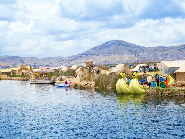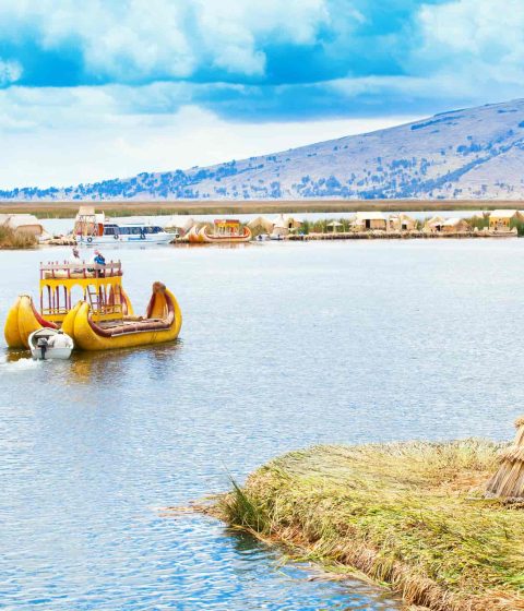 The floating islands of the Uros are located in the bay of Puno, finally once we reach the island of the Uros we will learn a bit about the lifestyle that is still preserved in the place, we have to take a journey to the past to understand the reality that still keeps alive, millenary activities, fundamental for the survival of the population of the place, dedicating themselves to fish and hunting birds also depending completely on the Totora (Aquatic Plant of the Lake) a Plant with which they build their islands, houses, rafts and that also serves as food and fuel. On the island live very friendly people descendants of Los Uros who were one of the oldest ethnic groups that inhabited the highlands, they will gladly show us how they have built their islands made with large blocks of the roots of the Totora that makes them float due to the Porosity of the blocks aided by the gases produced by its decomposition. People have a very hard job joining the blocks and also they have to put a layers of Totora, somemething that must be replaced every 20 days.